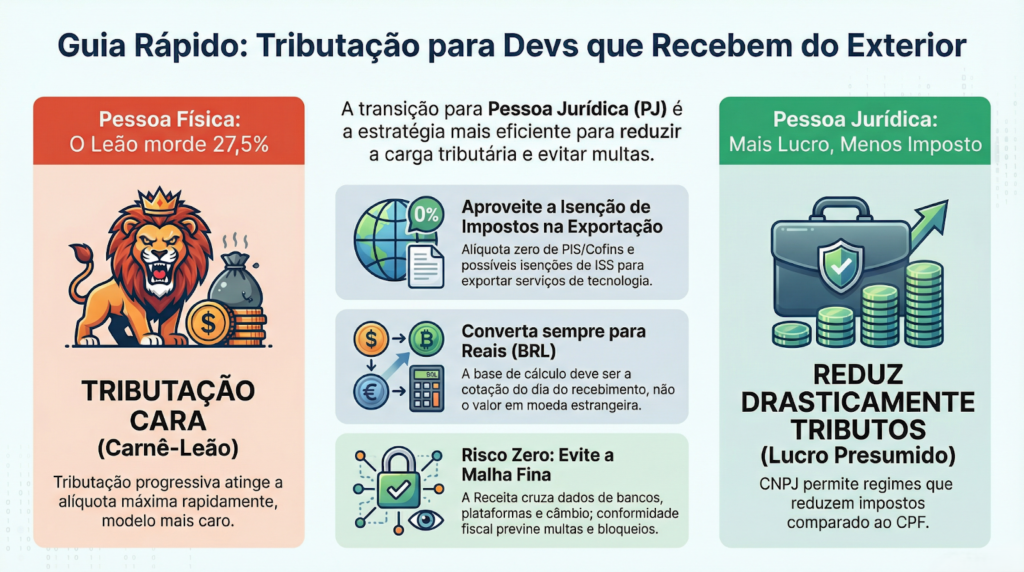 A definição da estrutura correta é um dos pilares das regras fiscais para devs que recebem do exterior. O impacto tributário muda completamente conforme a forma de recebimento.